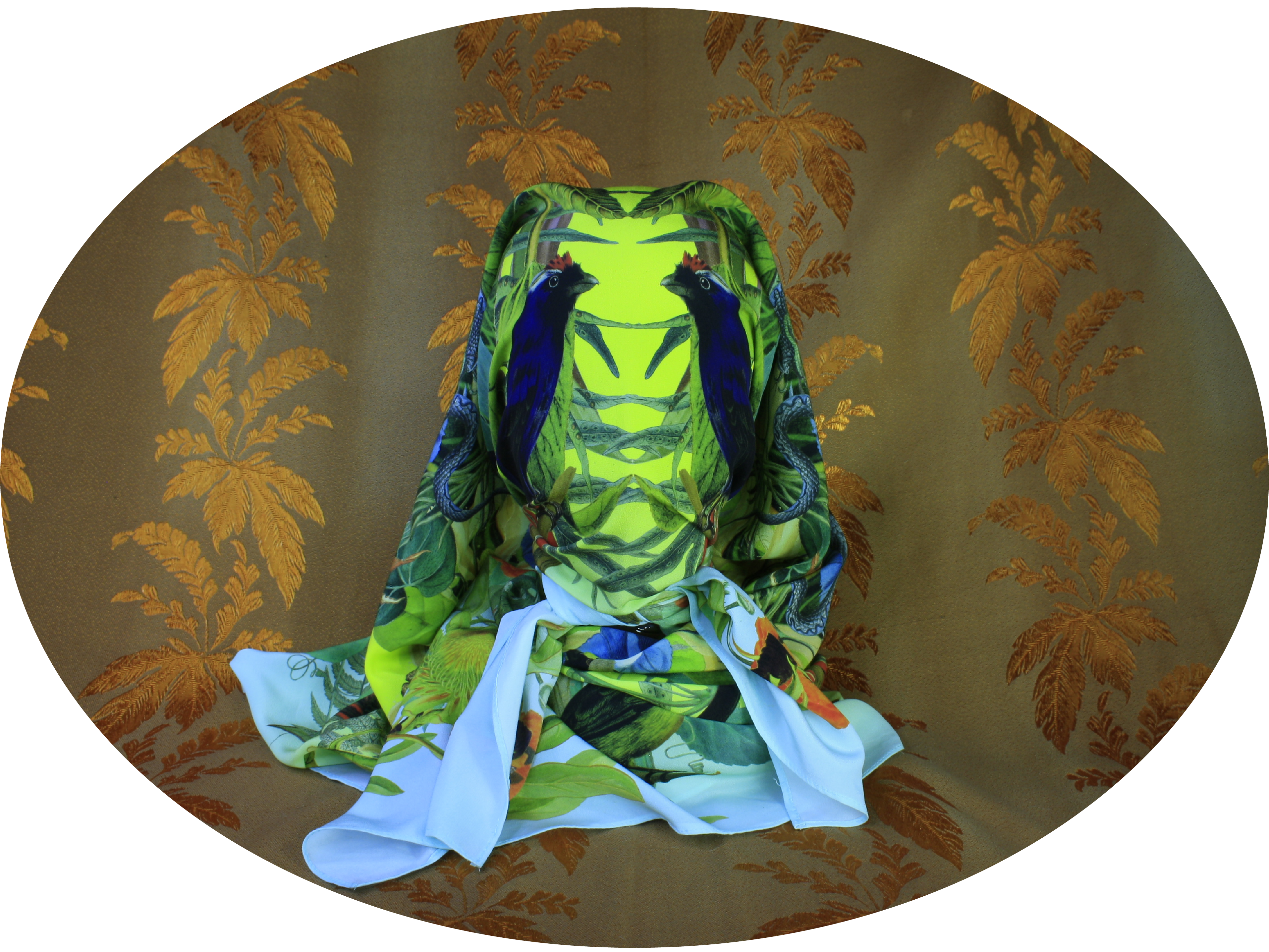 Weird yet wonderfully elegant botanical, zoological and entomological patterns decorate 100% silk crêpe de chine scarves. Evocative of king-sized vintage silk carrés, The Lotos Eaters Silk Scarves give that touch of old worldly luxury with an other worldly feel.